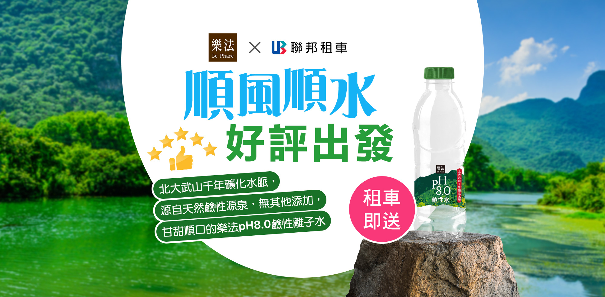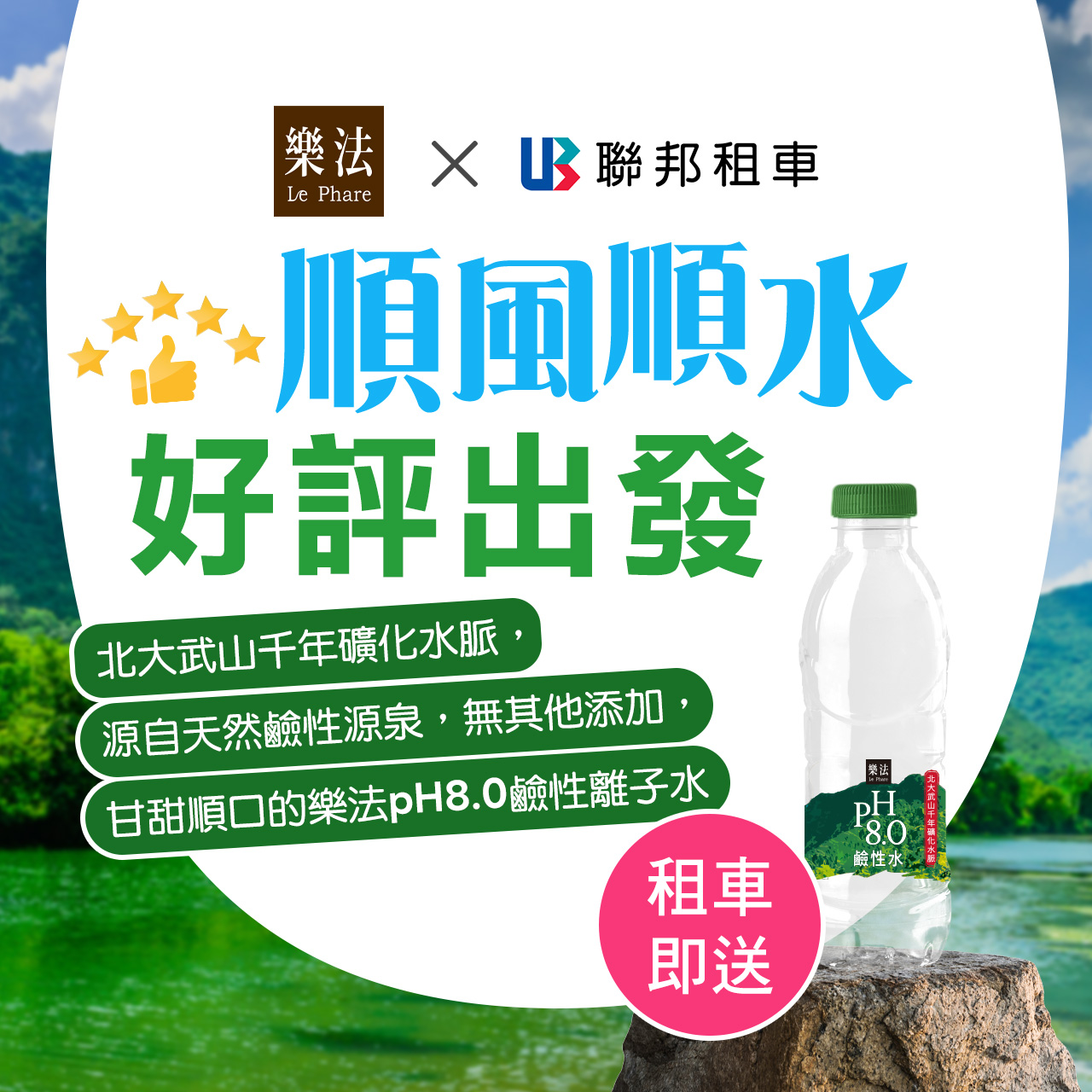 優惠內容:活動期間內,汽車承租人可享贈2瓶樂法pH8.0鹼性離子水,於取車時贈送乙次。