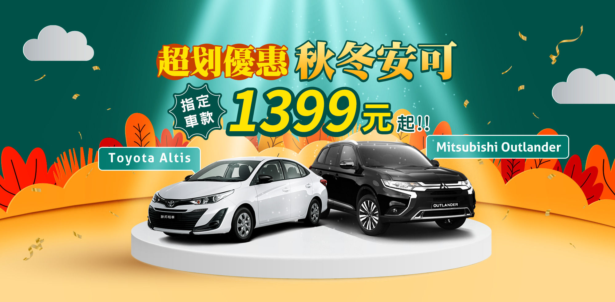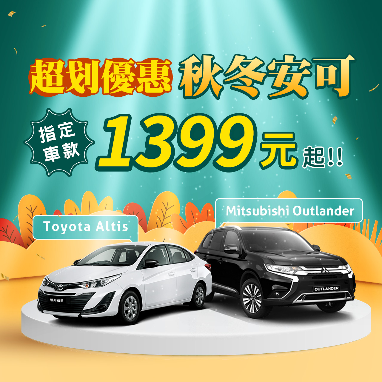 優惠內容:活動期間享Toyota Altis平日1,399元/日、假日1,599元/日,Mitsubishi Outlander (5人座)平日1,599元/日、假日1,799元/日、連租30日 24,999元(限電話、臨櫃預約),租金定價依本公司官網為基準。