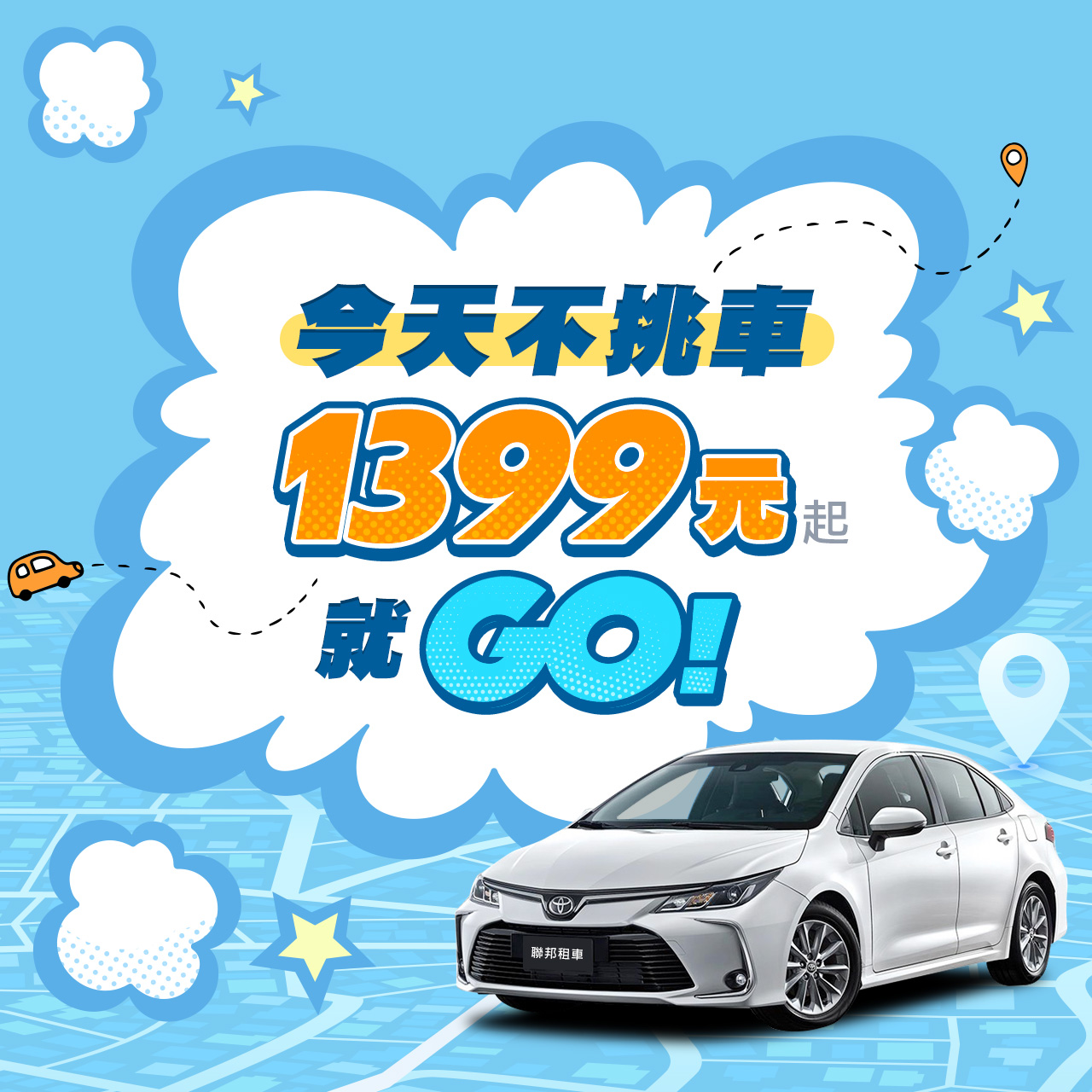 優惠內容:【限量】不指定車款優惠(Toyota Altis同級或升級車款)享平日專案價$1,399、假日專案價$1,699,取車站點將視現場調度狀況限量提供車輛。
